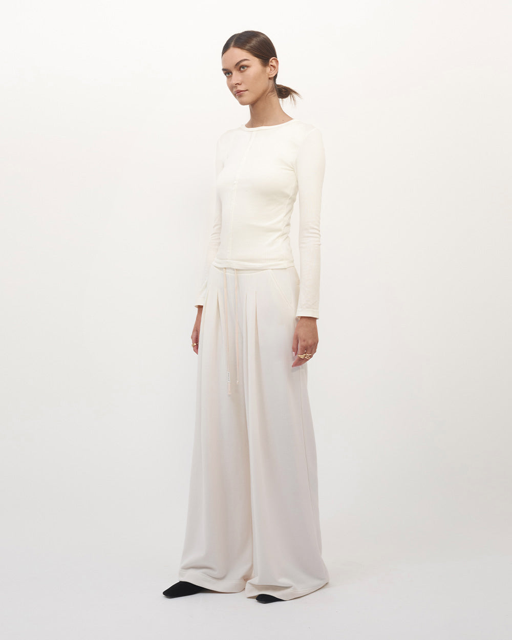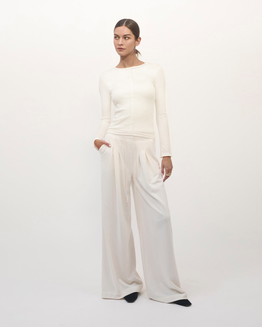 - Raw edge detail at neck + sleeve trim