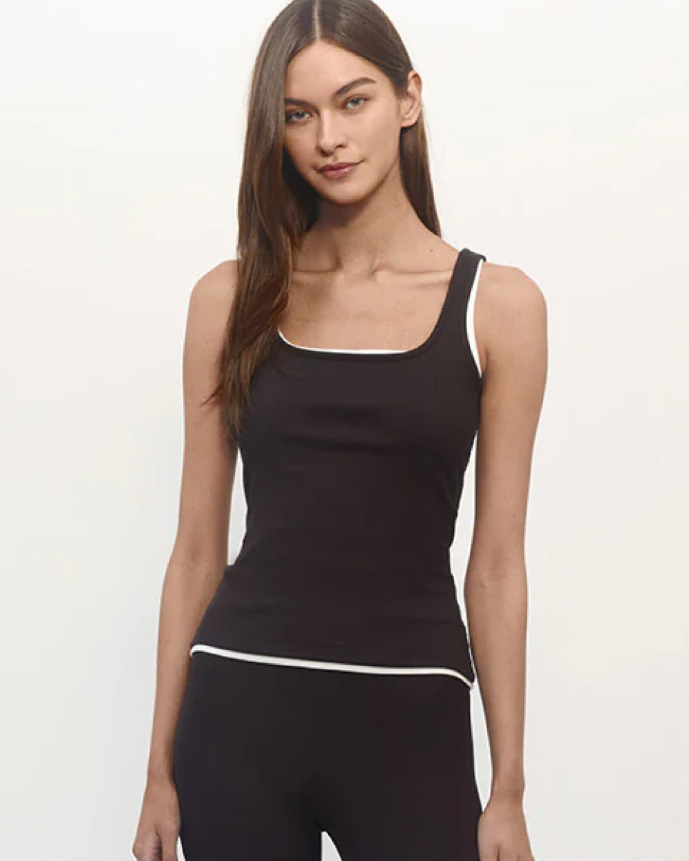 Elevate your wardrobe with the BLAKE TOP in BURGUNDY. Made from Nylora's signature 4-way stretch rib fabric, this square neck tank top combines both comfort and style. The sleeveless design and logo tab label on the back hem add a touch of sophistication to this midnight-colored top